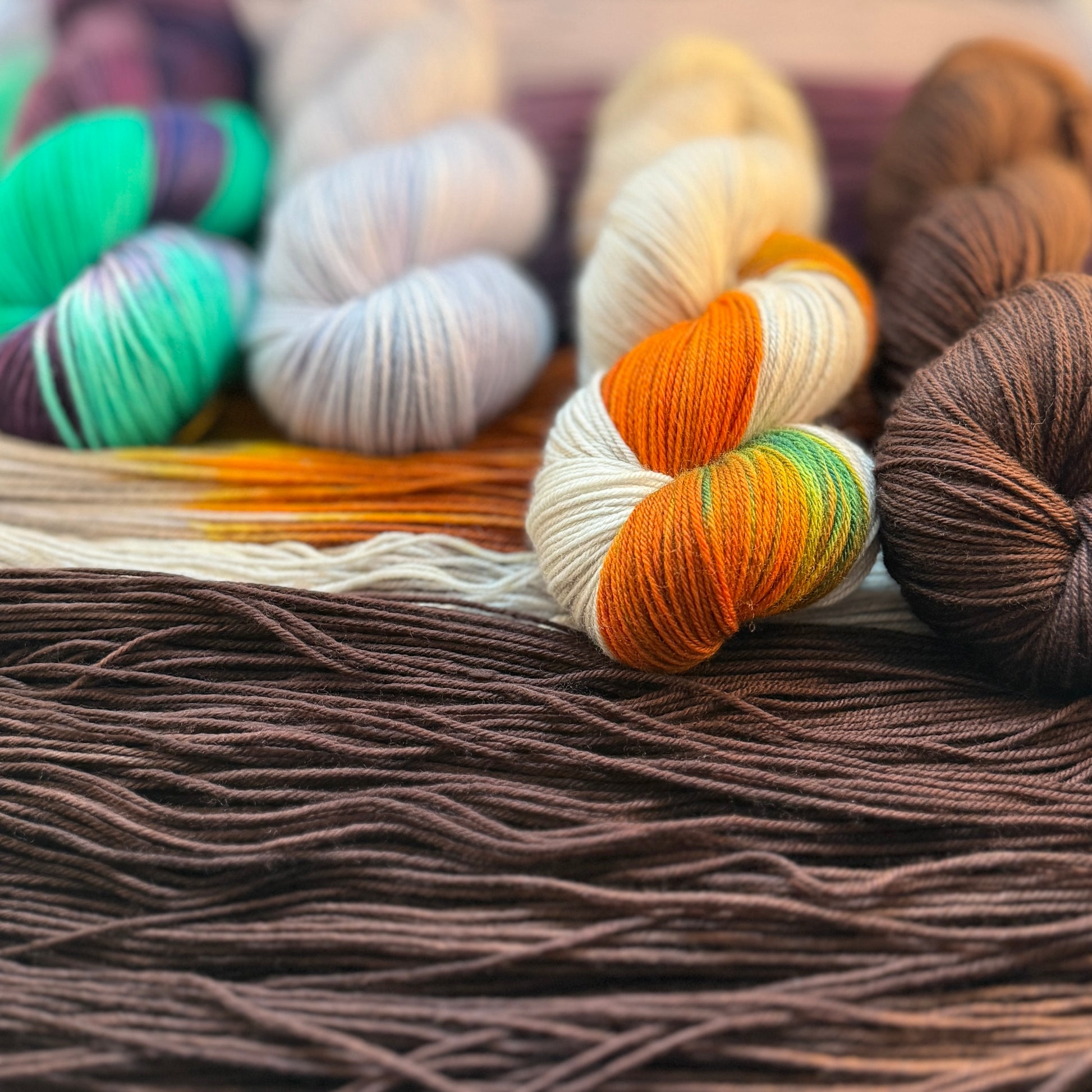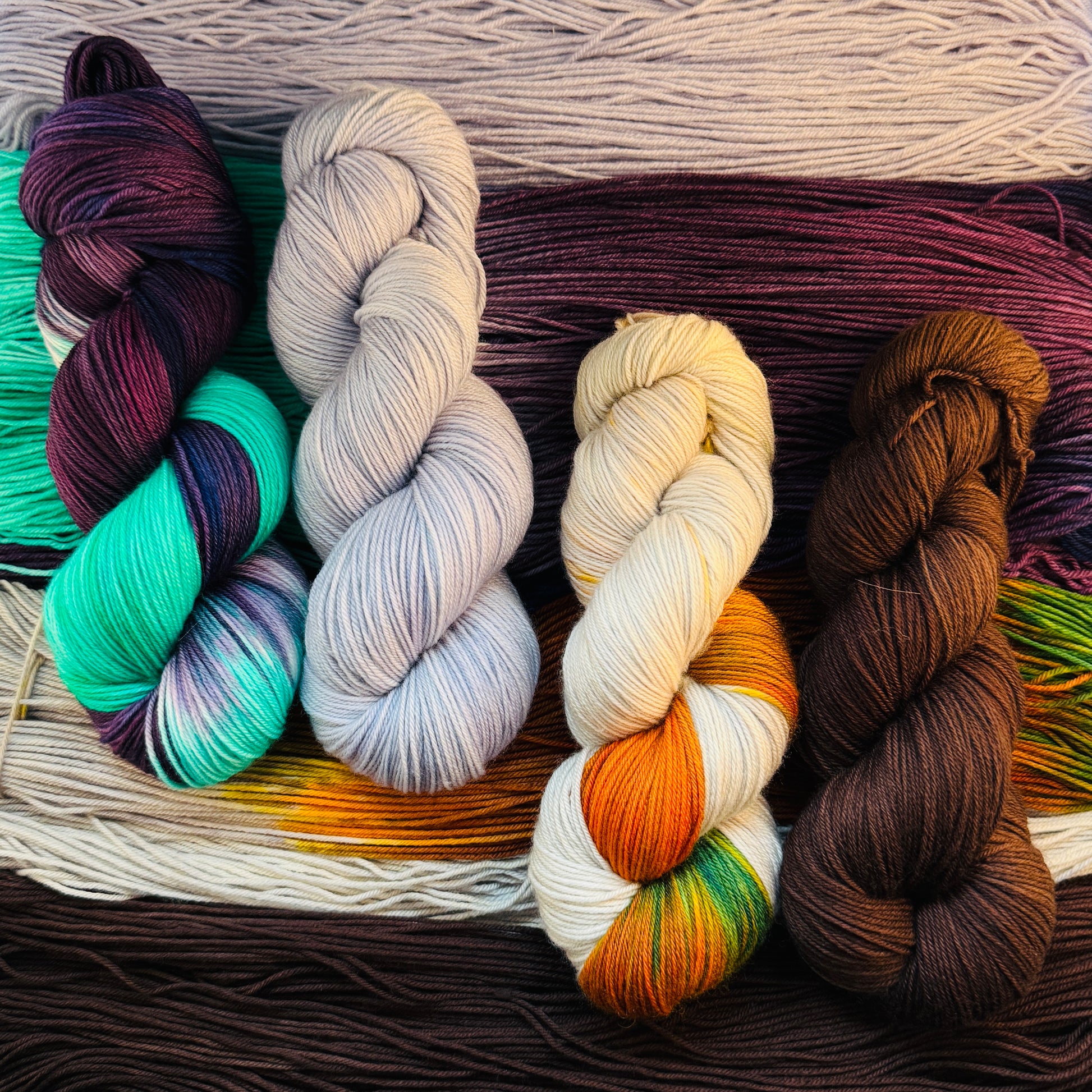 Four skeins, two duos, endless possibilities. The Enchanted Harvest Pack brings together the fiery glow of Pumpkins with the deep Gothic brown of Bran, and the mystical Witch's Brew with the lavender gray calm of Lancre.
