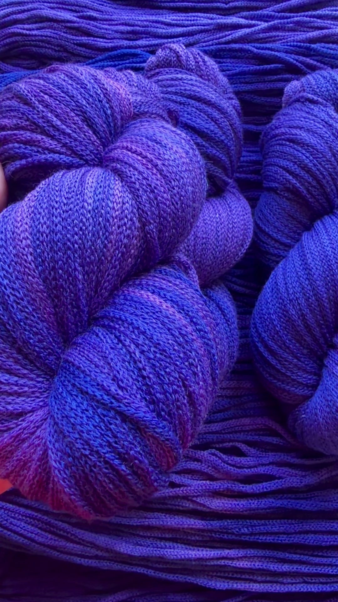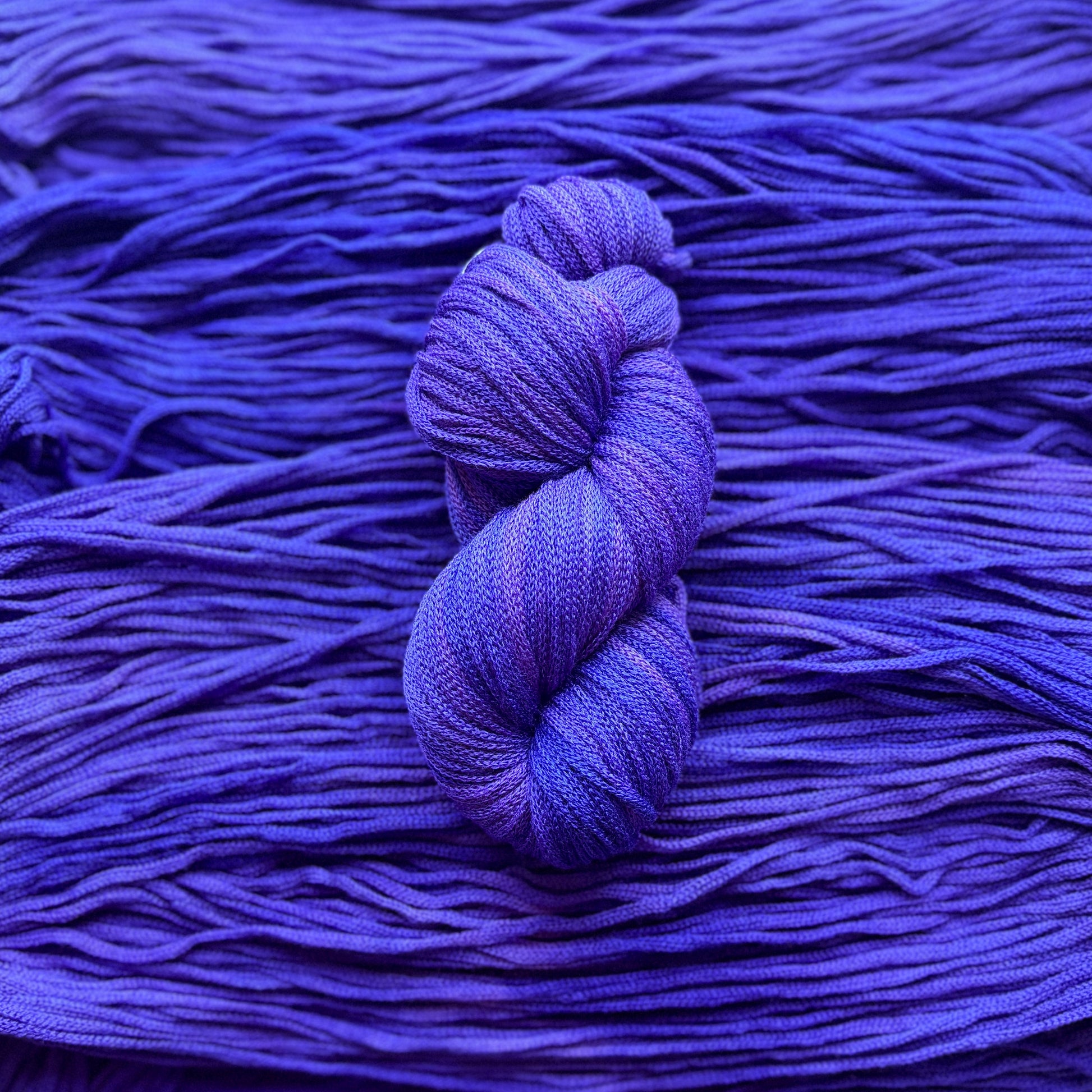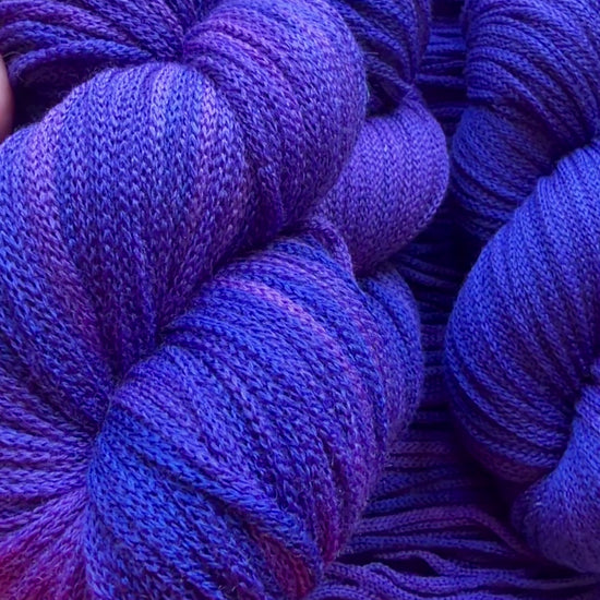 Indulge in this luxurious aran-weight treasure: a rare, hand-dyed tonal purple-blue that flows between soft lavender hints, deep amethyst richness, and subtle cool blue undertones. The color shifts gently in the light, creating a mesmerising, almost magical depth that looks different from every angle; subtle, sophisticated, and utterly addictive.