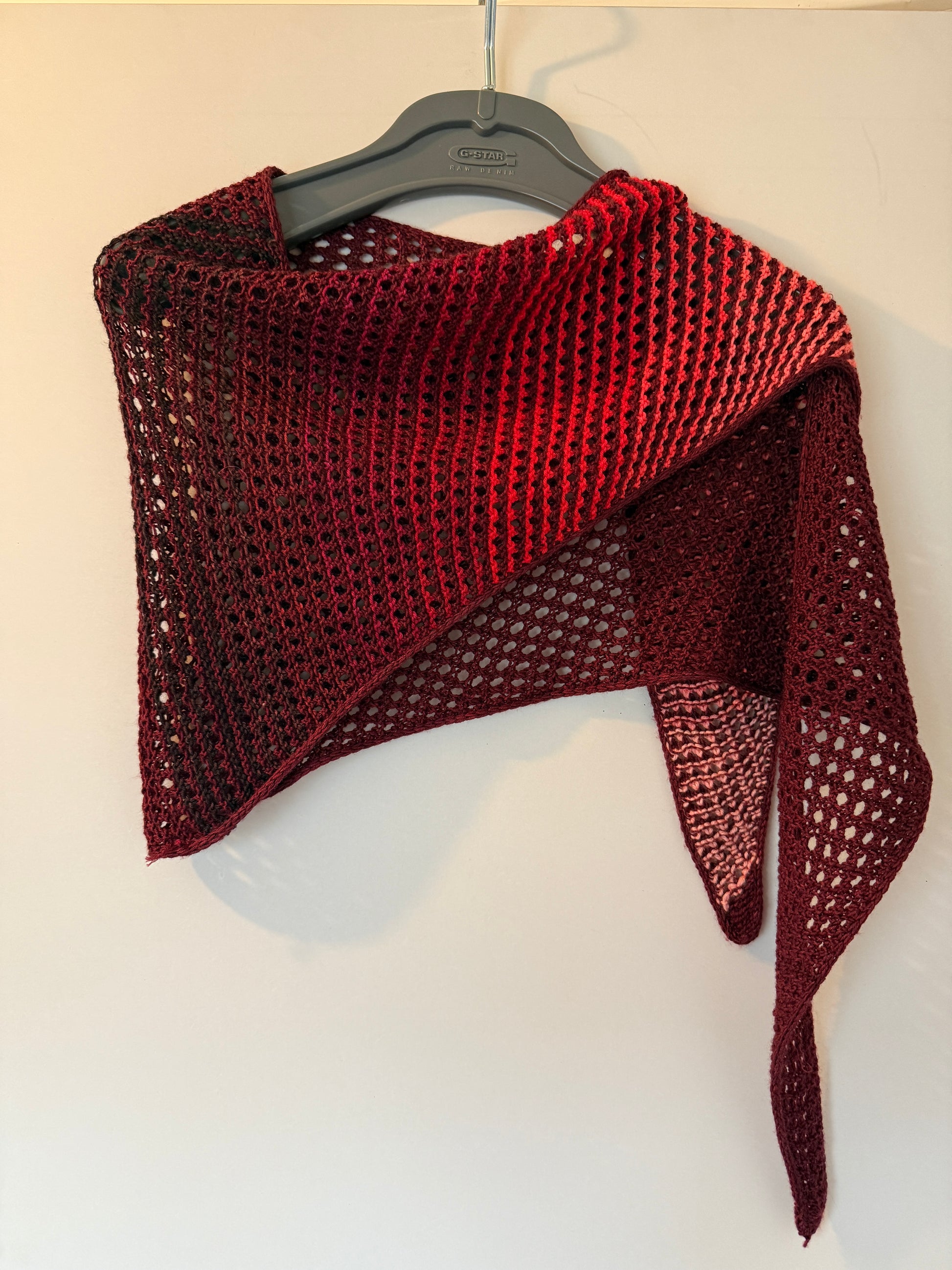 For the S-sized sample, a combination of Silkn'n Wool by Wol met Verve (fingering-weight, 459y/420m per 100g, 75% merino, 25% silk) in the colour Mahogany (MC) and scraps (fingering-weight, 85% merino wool, 15% nylon, 437y/400m per 100g) as a CC gradient were used. The scarf has CC stripes until about halfway through and continues in MC afterwards.